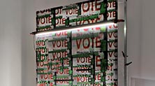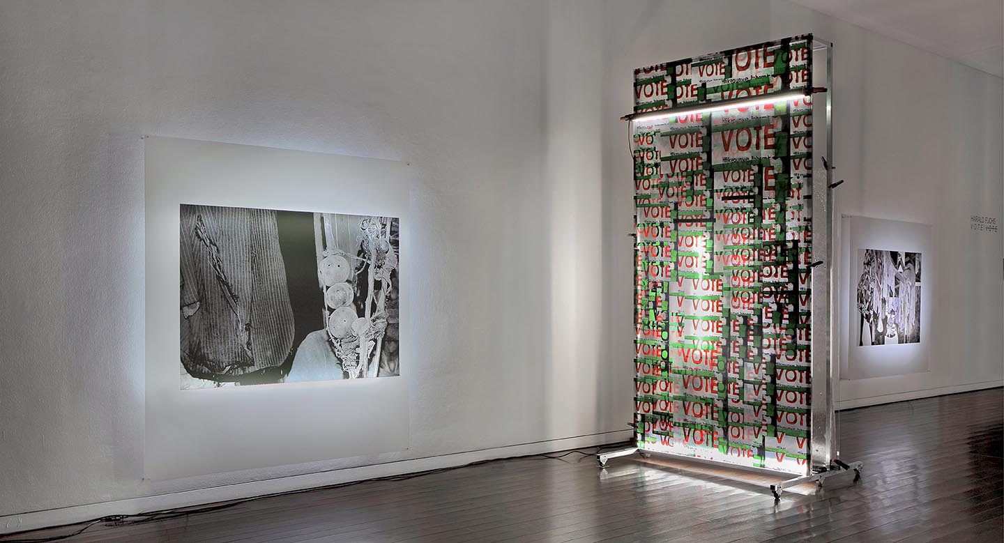 Mehrschicht-Motiv. Stoffdruck mit Keder. Direktdruck auf Plexiglas mit Schienenmontage.